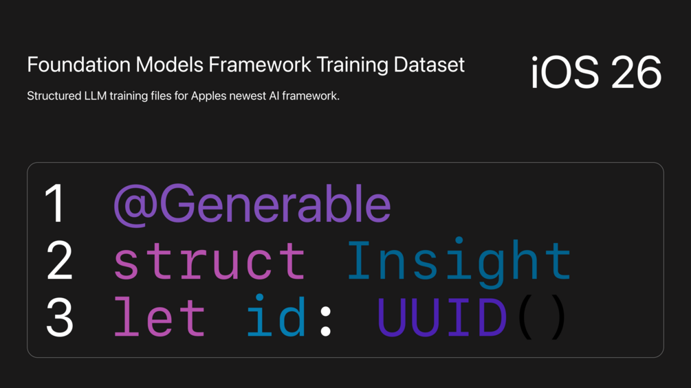A complete training dataset for Apple’s unreleased Foundation Models Framework (iOS 26). Includes 3 LLM-optimized guides covering APIs, tool protocols, and adapter training—essential for AI models supporting iOS development.